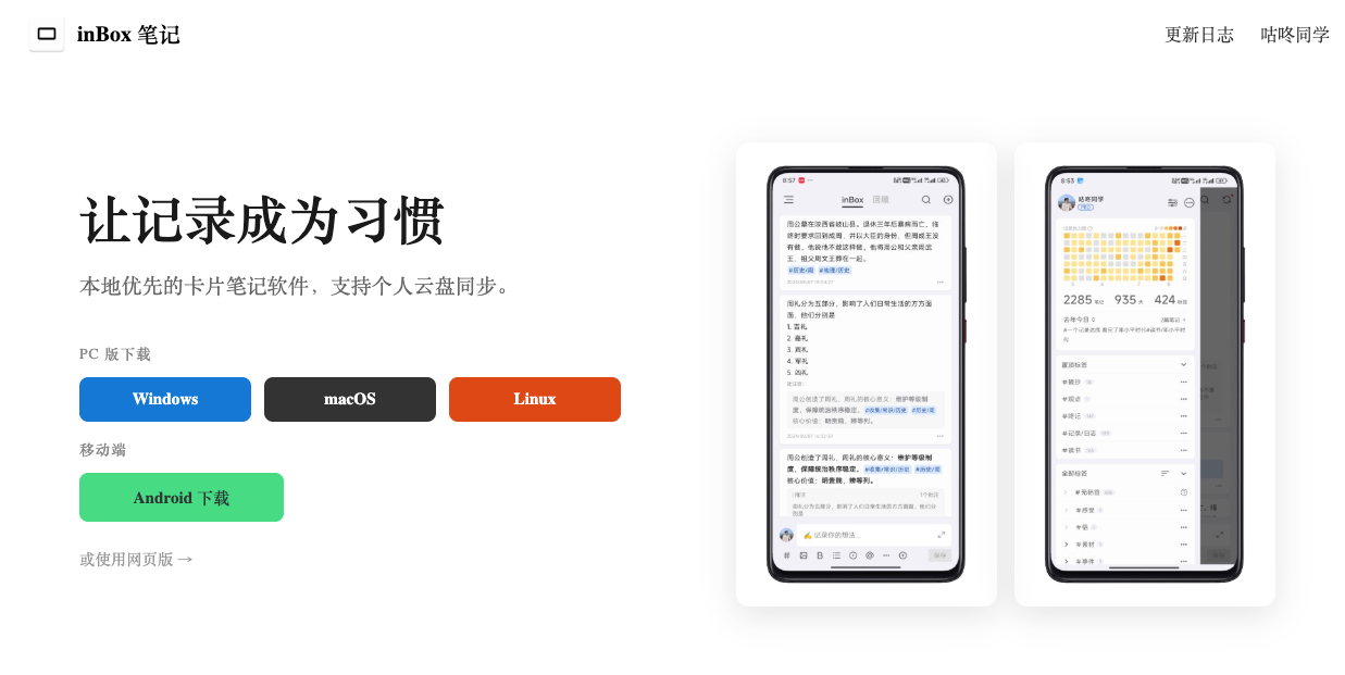 目前 inBox 笔记已支持网页端、PC 端,大家可以在 https://inbox.gudong.site/#/ 这里进行下载。