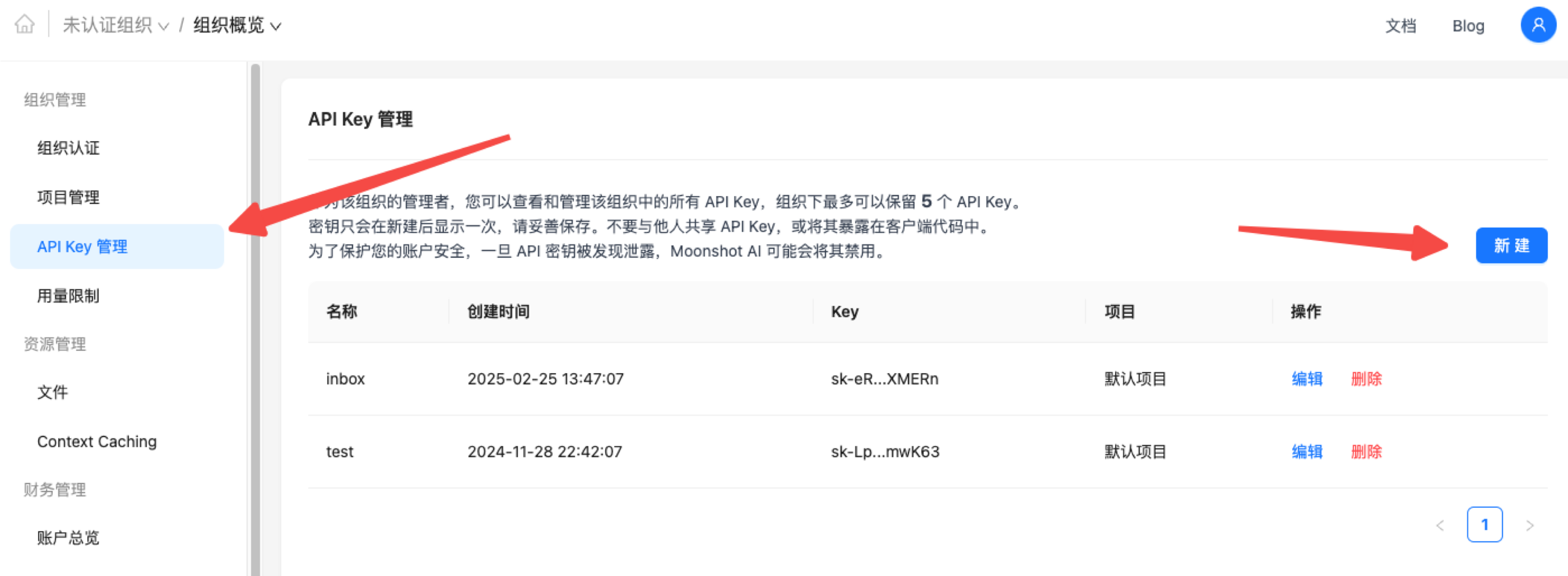 - 首先,你需要在 Kimi 的用户中心(点击访问)中创建一个 API key,点击