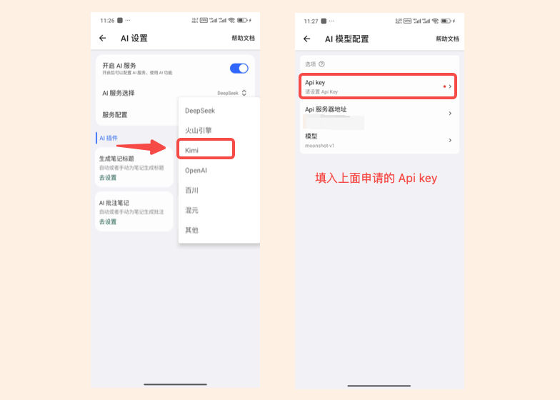 AI,然后在 AI 服务选择下选择Kimi,选择后,点击去配置,在下一个页面中,打开 API key,填入上面申请的 Api Key,服务器地址和模型 inBox 已经帮你填好了,一般情况下不用修改,这样就配置好了 Kimi 服务。