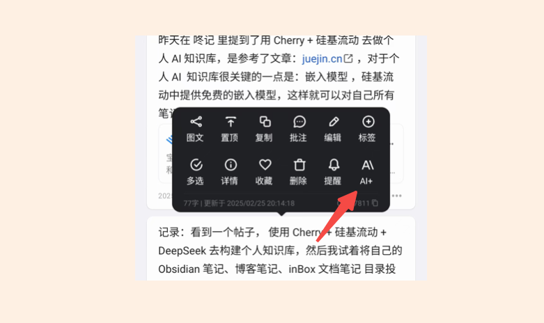 - 配置完成后,来到笔记主页,选择一个笔记,点击笔记卡片右下角的菜单,点击