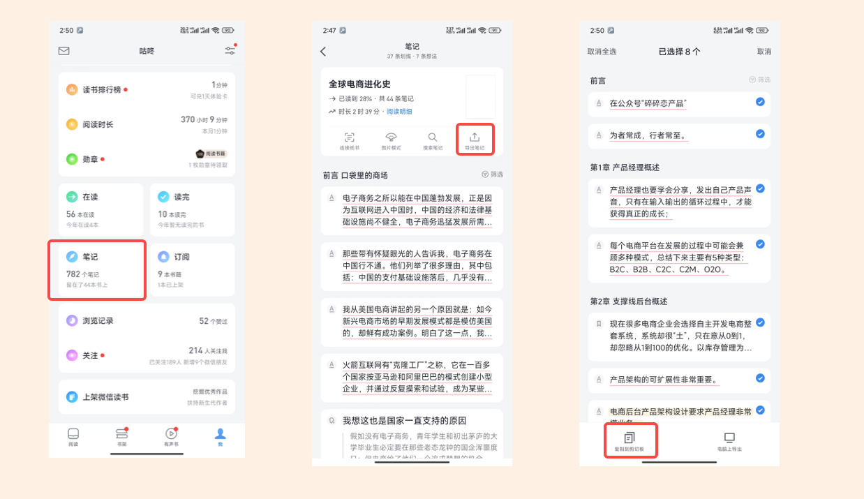 在微信读书中选择「我」页面,打开笔记模块,找到对应书籍的读书笔记,选择导出,然后复制到粘贴板