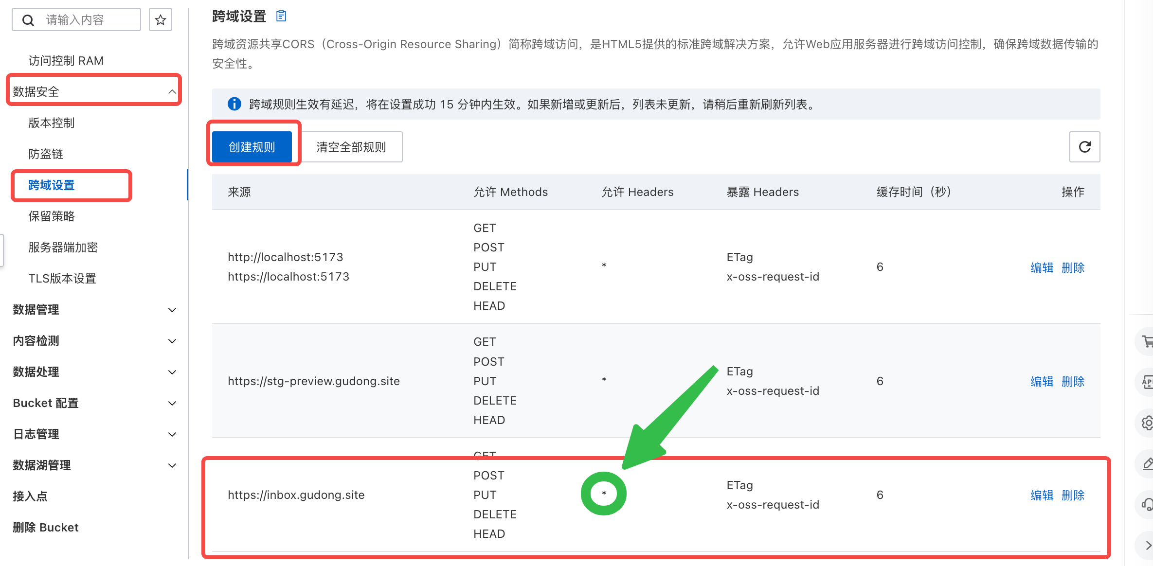 为确保 inBox 网页版能正常访问您的 OSS 存储空间,需要配置跨域规则:
