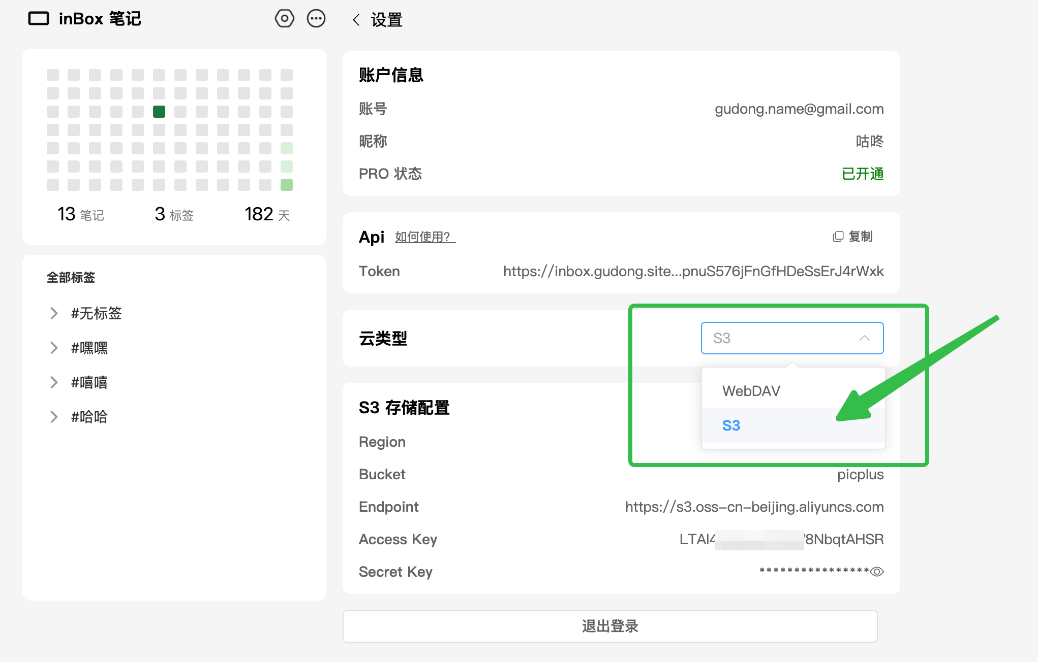 下面分别介绍如何在 inBox 笔记 App 和网页版中配置 S3。