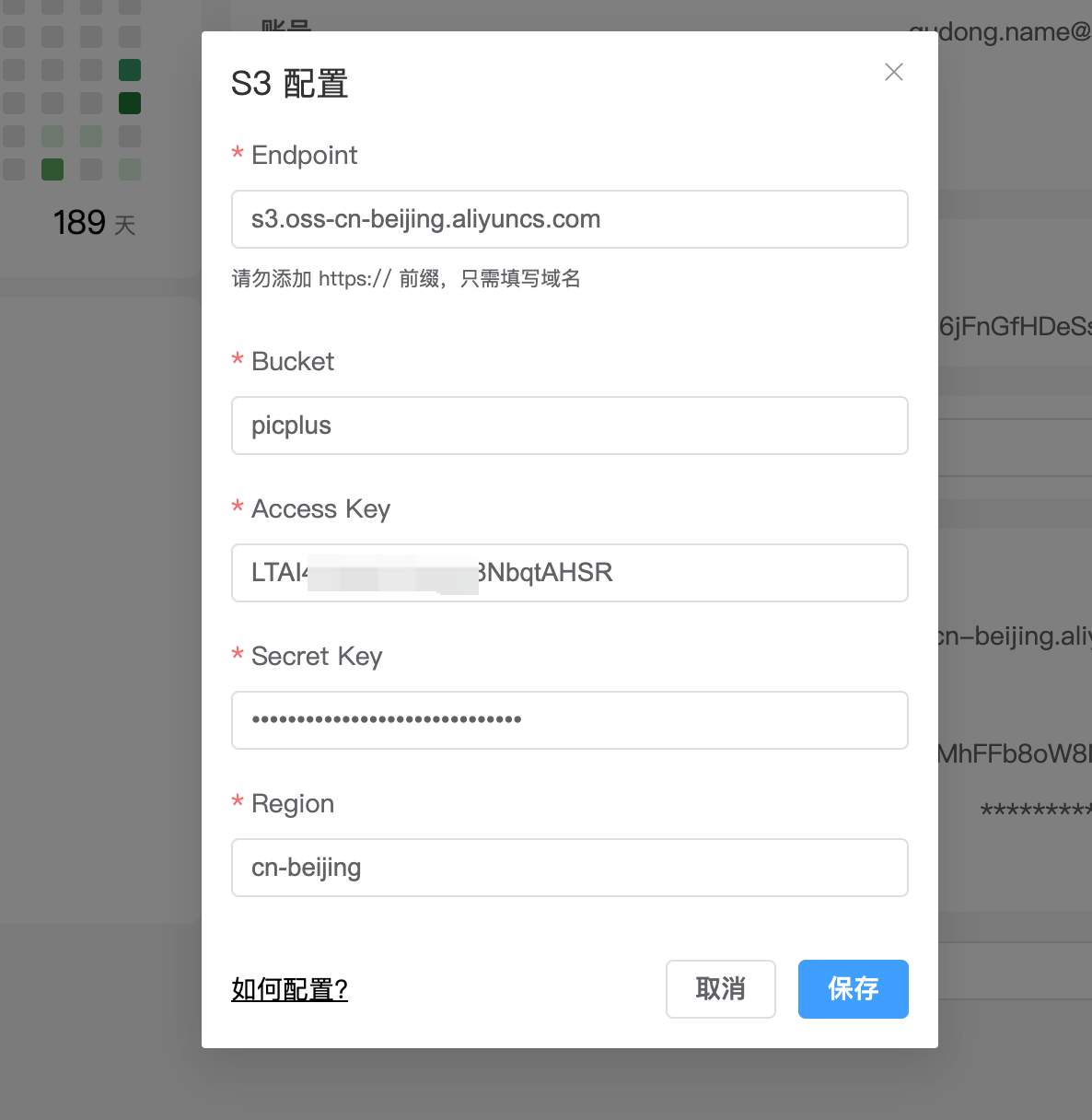配置信息跟手机端一致,不过需要注意,网页端需要配置跨域规则,否则会导致 inBox 网页版无法正常访问您的 OSS 存储空间。
