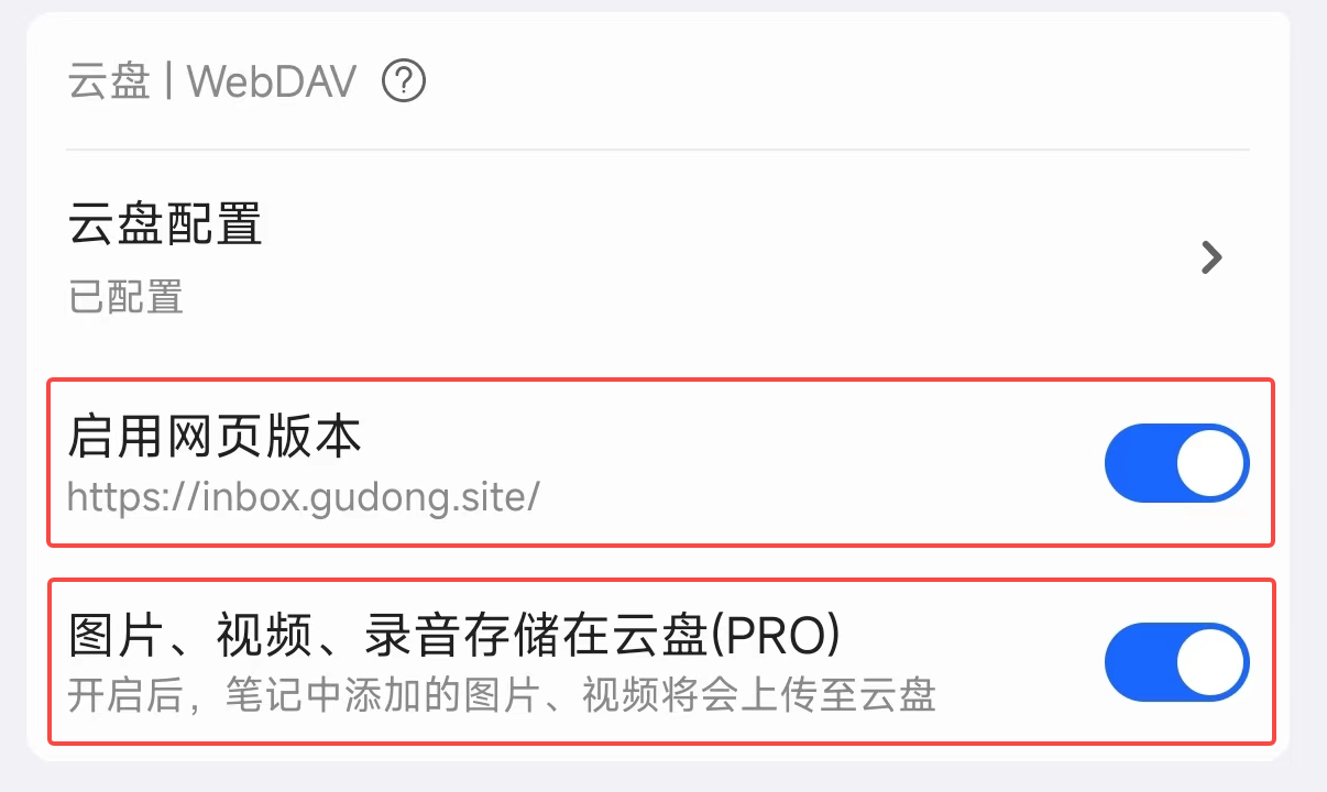 启用网页版时,会把坚果云配置信息同步至 inBox 后端,以便 inBox 网页端使用坚果云进行笔记拉取上传操作。