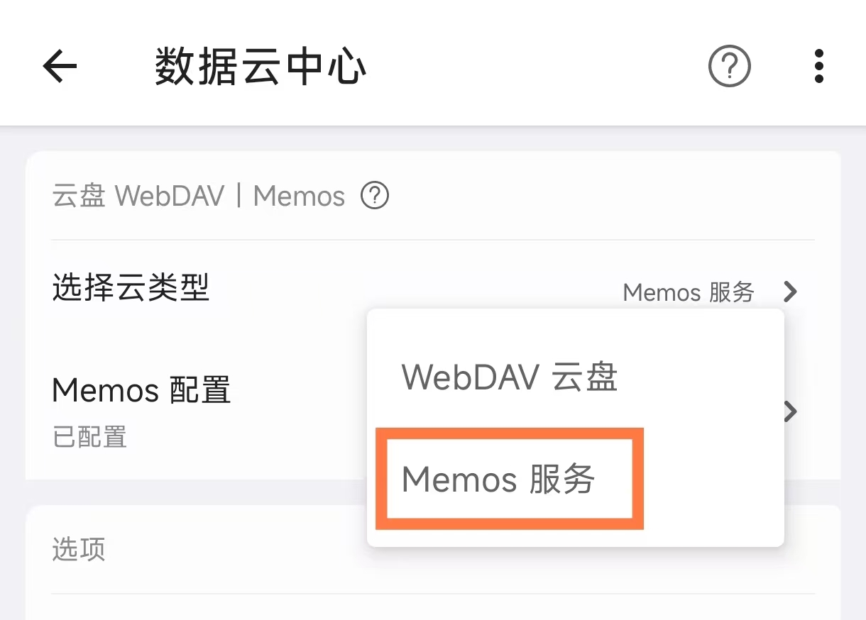 2、打开 inBox 笔记,点击首页右上角菜单 > 选择 数据云中心 > 选择云类型 > Memos 服务