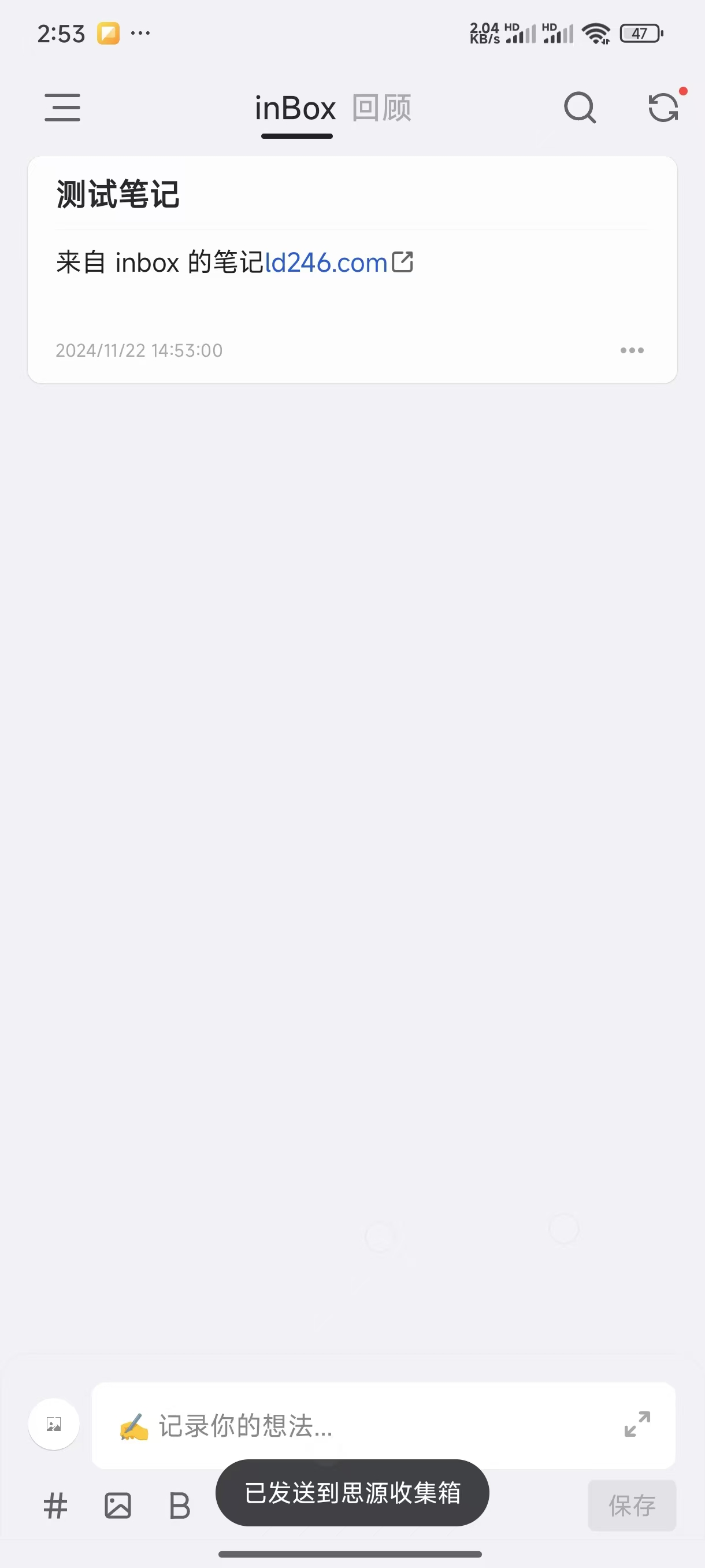 配置完毕后,打开同步开关,后面每次发送笔记后,都会自动同步到思源收集箱。