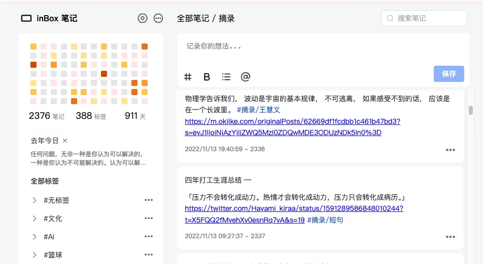 笔记记录的久了,回顾之前的笔记就变得更有意义,inBox 网页版中也实现了去年今日,只要记录笔记的时间超过一年,这里就会提示之前记录的笔记,点击那个小叉号 ,可以暂时关闭掉。