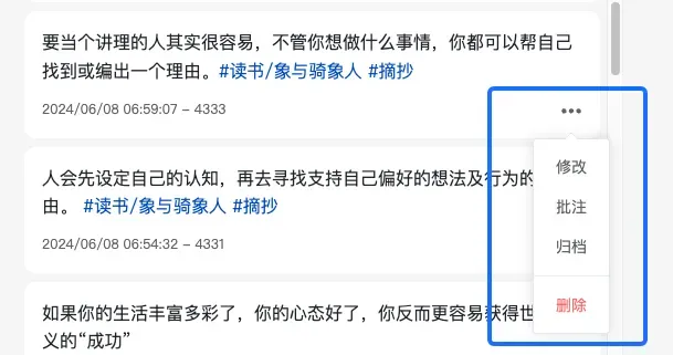 主页笔记列表,点击菜单后就可以对笔记进行操作。