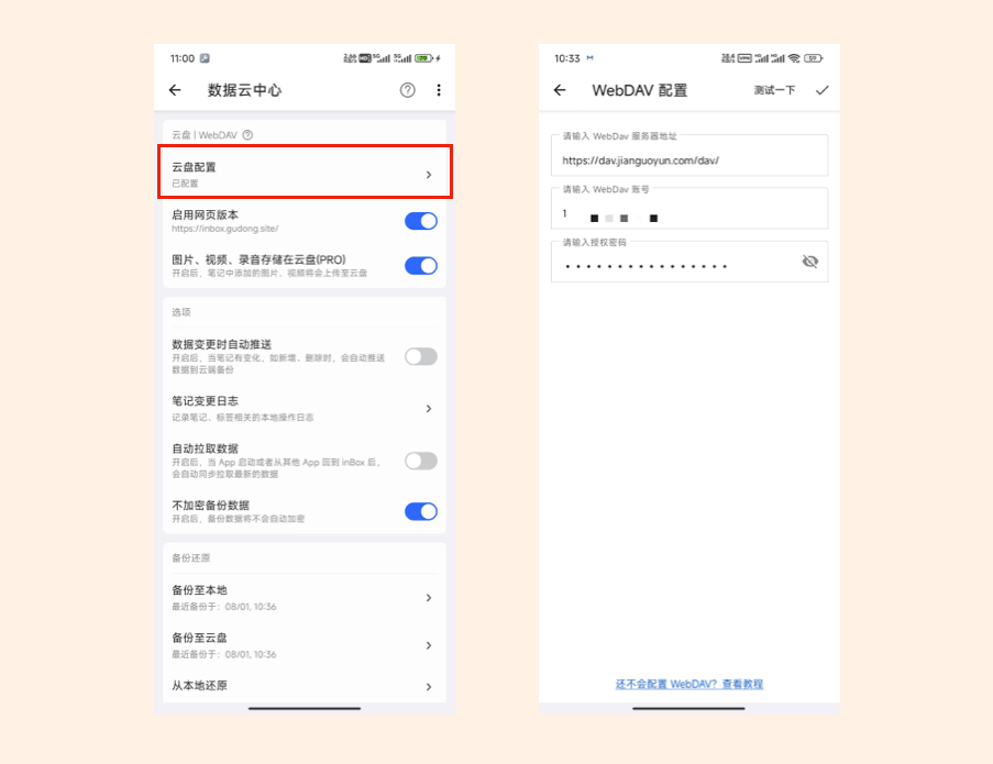 WebDAV 是目前个人网盘中常用的数据备份同步方案,作为普通用户,只需要注册一个坚果云账号,就可以有一个自己的 WebDAV 网盘,然后在 inBox 手机客户端配置好云盘信息,客户端和网页端就可以使用同一份备份文件,从而达到数据同步的目的。